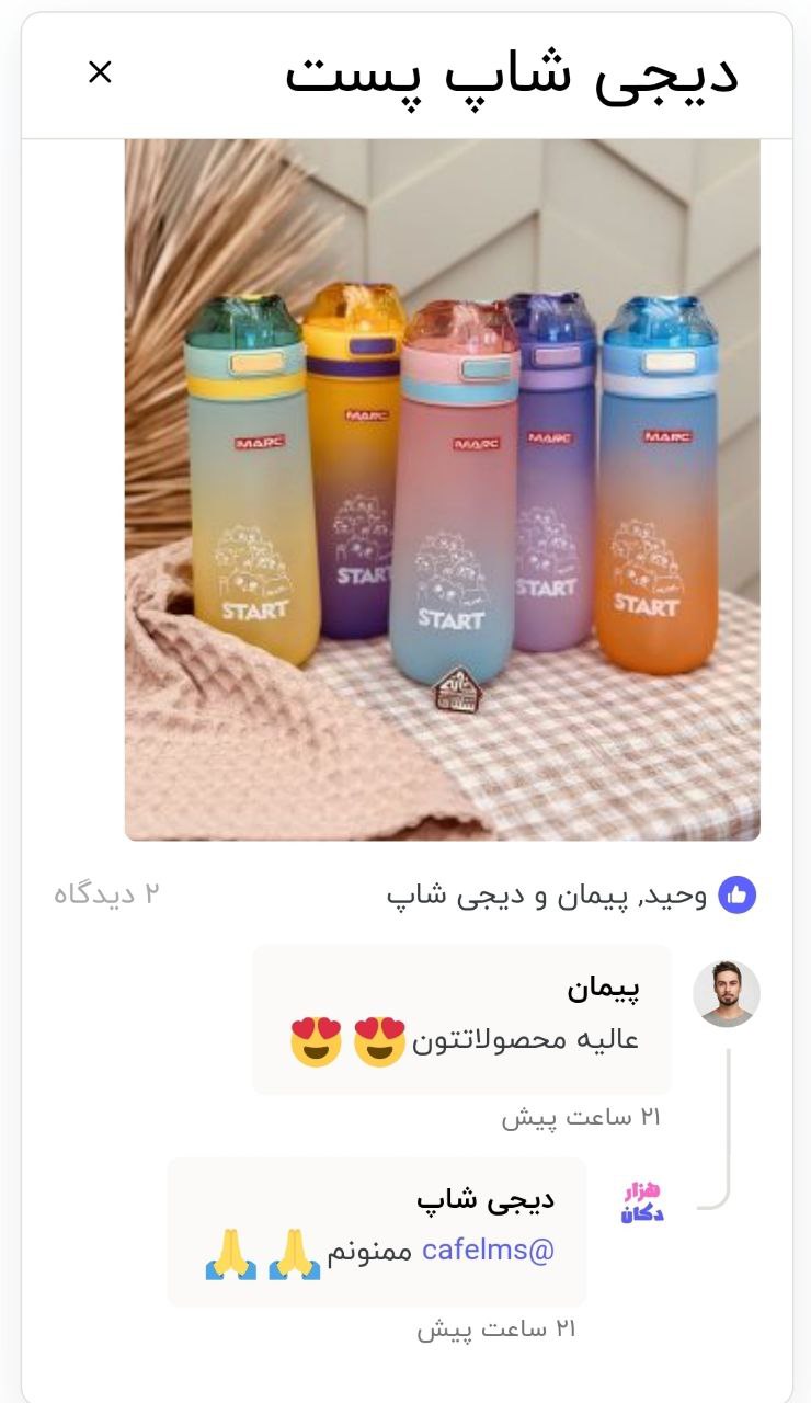 و برندت یک قدم جلوتر میره.ارتقا به پنل فروشندگانگزارش گیریمانیتورینگ کامل فروشبا تحلیل داده های لحظه ای می توانید فروش خود را افزایش دهید (تمامی خدمات هزار دکان رایگان است)ارتقا به پنل فروشندگاننسل جدید فروشگاه اینترنتیFREEاکسپلور هزار دکان رو بترکونبا تمام مشتریان ارتباط مستقیم بگیر و فروش رو افزایش بدهارتقا به پنل فروشندگان